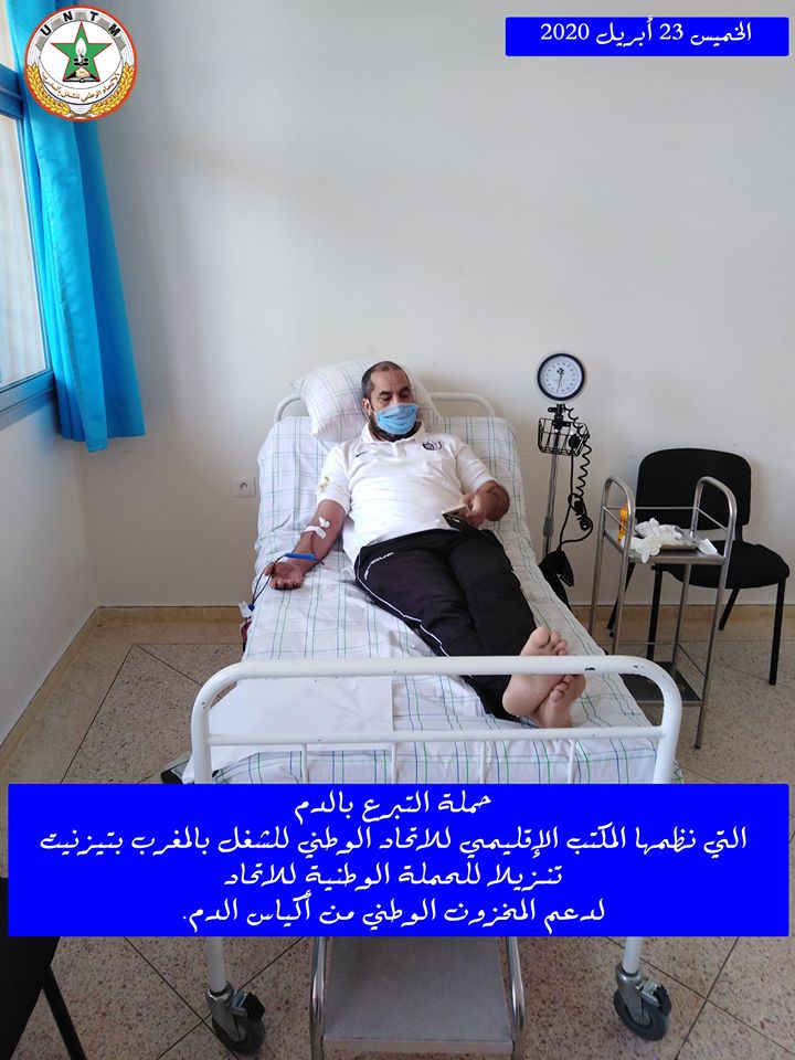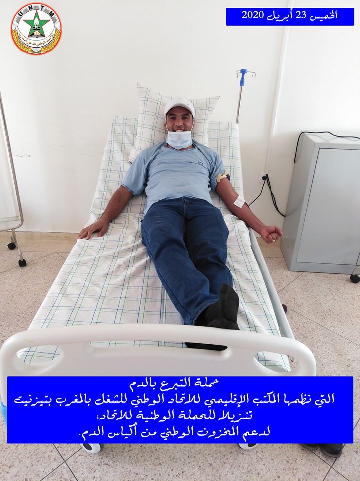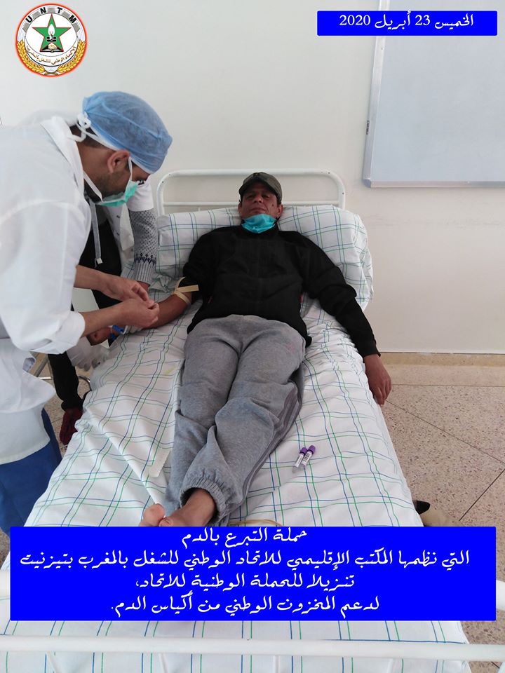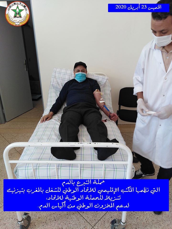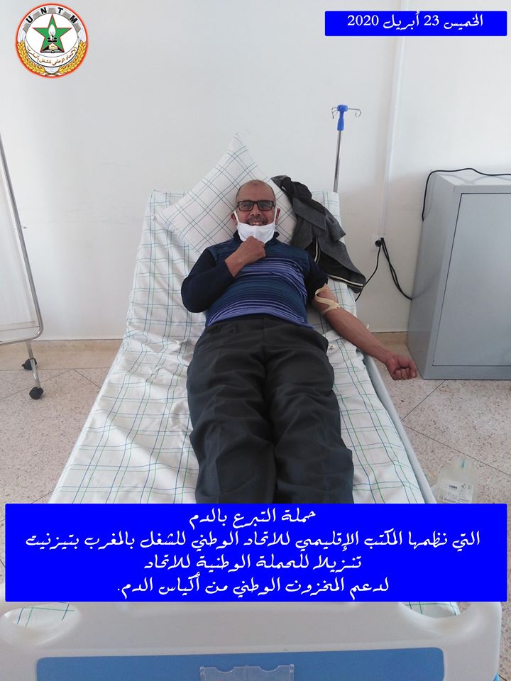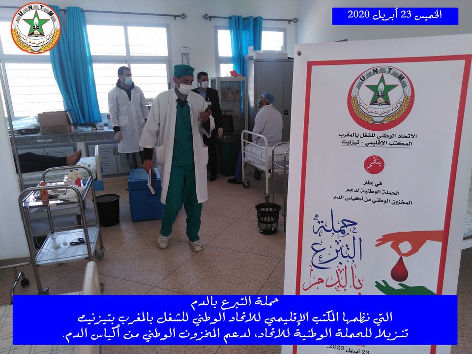 في إطار الحملة الوطنية لدعم المخزون الوطني لأكياس الدم، التي ينظمها الاتحاد الوطني للشغل بالمغرب تحت شعار “تبرعك بدمك .. عطاء لوطنك”، نظم المكتب الإقليمي للاتحاد الوطني للشغل بالمغرب بتيزنيت يوم الخميس 23 أبريل 2020، حملة للتبرع بالدم، وذلك بفضاء المعهد العالي للمهن التمريضية وتقنيات الصحة بتيزنيت، في احترام تام للتدابير الاحترازية المعتمدة.
