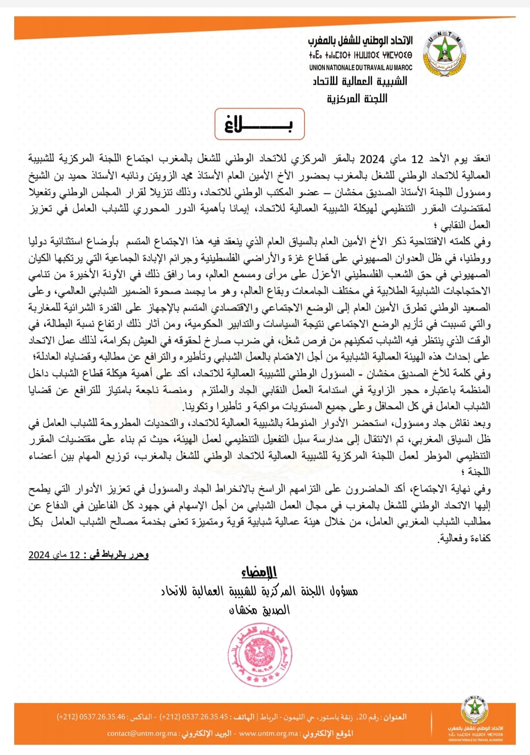 انعقد الأحد 12 ماي 2024 بالمقر المركزي للاتحاد الوطني للشغل بالمغرب، اجتماع اللجنة المركزية للشبيبة العمالية للاتحاد بحضور الأخ الأمين العام الأستاذ محمد الزويتن ونائبه الأستاذ حميد بن الشيخ ومسؤول اللجنة الأستاذ الصديق مخشان – عضو المكتب الوطني للاتحاد، وذلك تنزيلا لقرار المجلس الوطني وتفعيلا لمقتضيات المقرر التنظيمي لهيكلة الشبيبة العمالية للاتحاد، إيمانا بأهمية الدور المحوري للشباب العامل في تعزيز العمل النقابي.