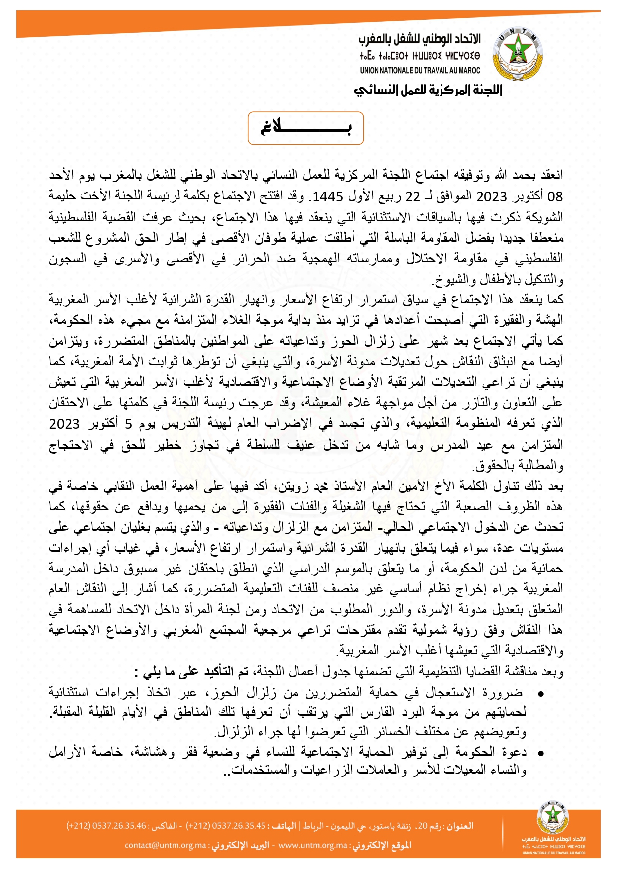 عقدت اللجنة المركزية للعمل النسائي بالاتحاد الوطني للشغل بالمغرب، اجتماعها العادي يوم الأحد 08 أكتوبر 2023 الموافق لـ 22 ربيع الأول 1445، بالمقر المركزي للاتحاد بالرباط.