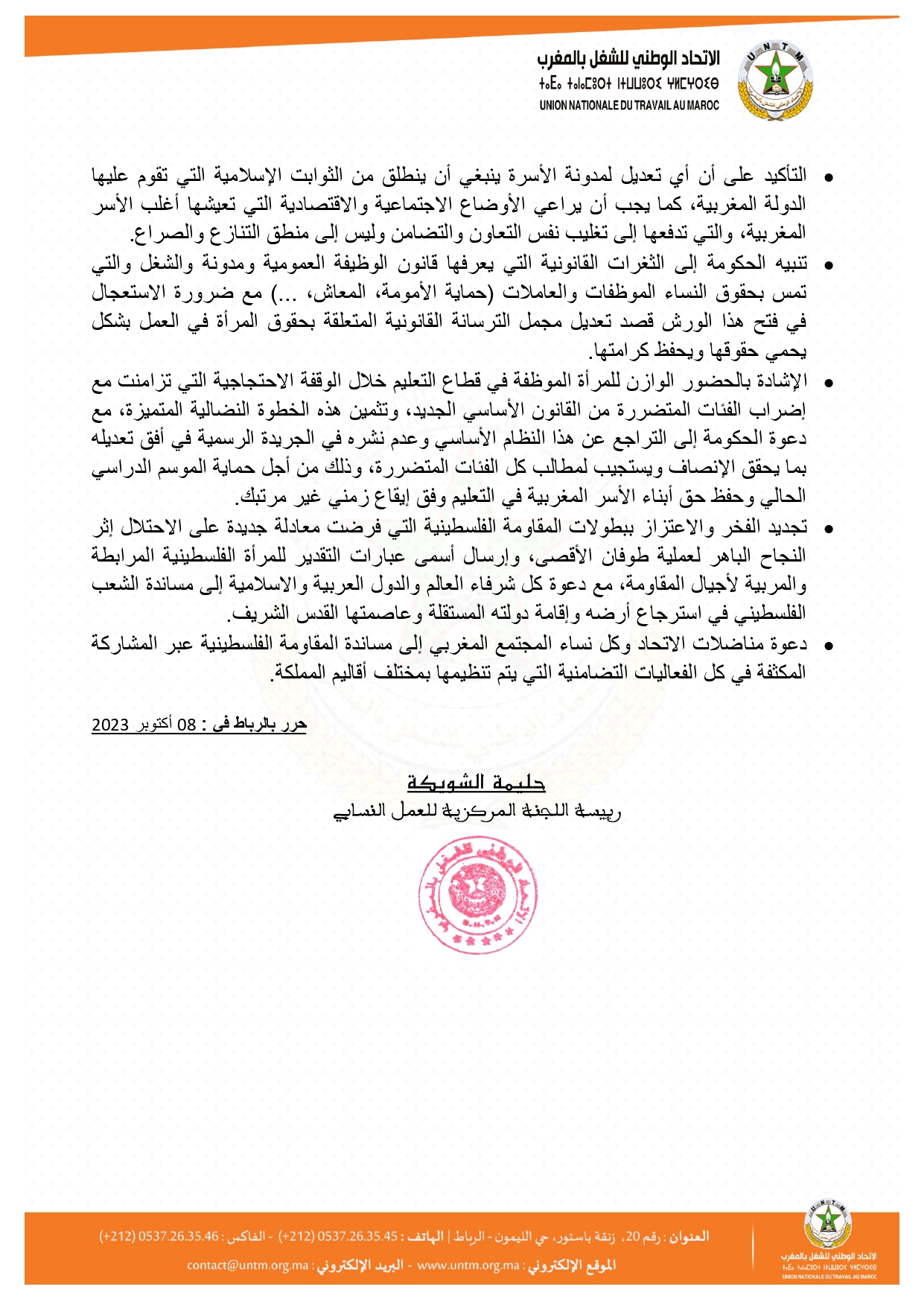 كما أشار إلى النقاش العام المتعلق بتعديل مدونة الأسرة، والدور المطلوب من الاتحاد ومن لجنة المرأة داخل الاتحاد للمساهمة في هذا النقاش وفق رؤية شمولية تقدم مقترحات تراعي مرجعية المجتمع المغربي والأوضاع الاجتماعية والاقتصادية التي تعيشها أغلب الأسر المغربية.