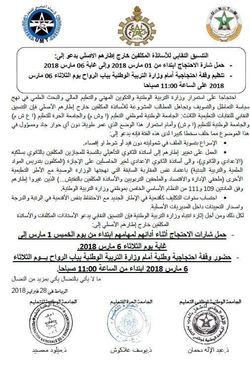 دعا التنسيق النقابي للاساتذة المكلفين خارج اطارهم الاصلي والذي يضم كل من الجامعة الوطنية لموظفي التعليم المنضوية تحت لواء الاتحاد الوطني للشغل بالمغرب، والجامعة الحرة للتعليم( ا ع ش م)، والجامعة الوطنية للتعليم،(ا م ش) (دعا)الأستاذات والأساتذة المكلفين خارج إطارهم الأصلي، إلى حمل شارات الاحتجاج أثناء أدائهم لمهامهم ابتداء من الخميس 1 مارس إلى غاية يوم الثلاثاء 6 مارس 2018، وحضور الوقفة الاحتجاجية الوطنية المرتقب تنظيمها أمام وزارة التربية الوطنية بباب الرواح يـــوم الثلاثاء 6 مارس 2018 ابتداء من الساعة 11:00 صباحا.