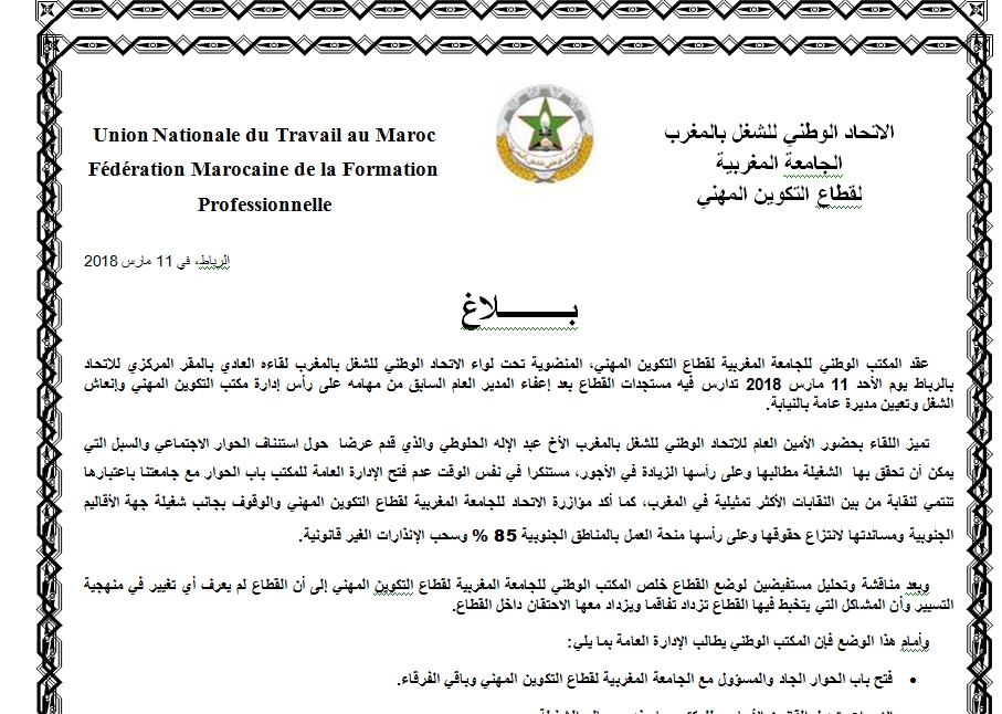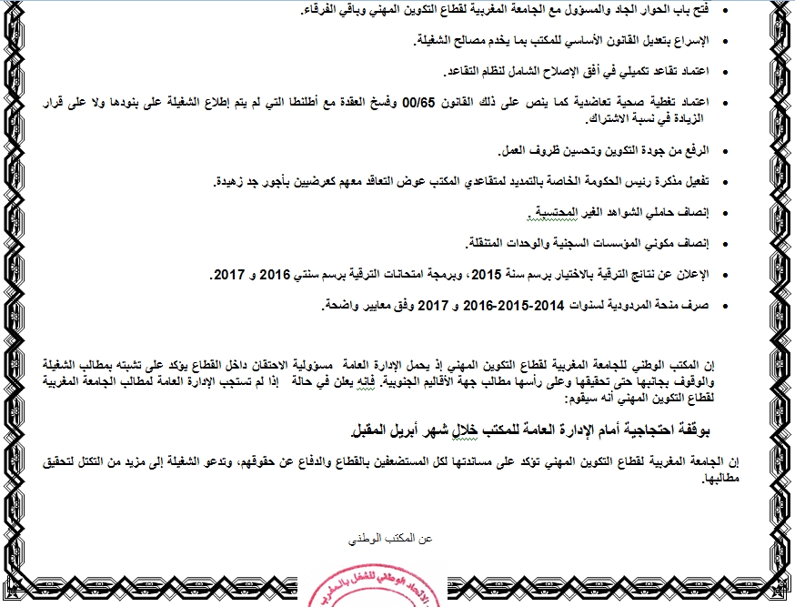 هذا وطالب المكتب الوطني للجامعة المغربية لقطاع التكوين المهني، الإدارة العامة، بفتح باب الحوار الجاد والمسؤول مع الجامعة باقي الفرقاء، والإسراع بتعديل القانون الأساسي للمكتب بما يخدم مصالح الشغيلة.