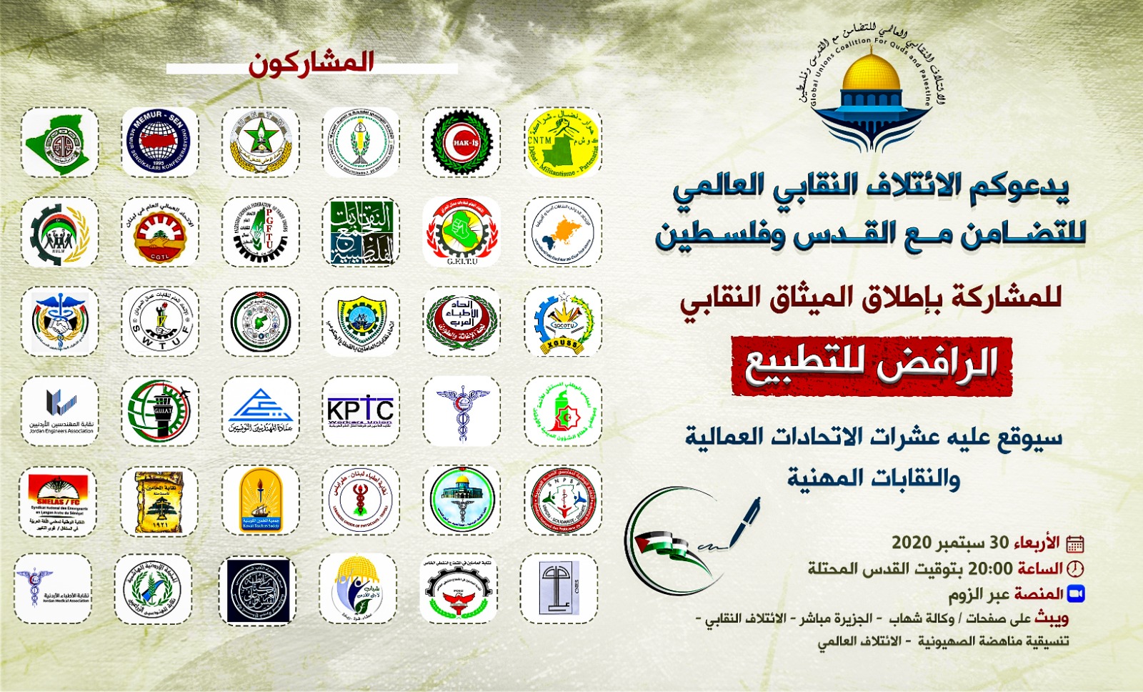 شارك الاتحاد الوطني للشغل بالمغرب في لقاء عن بعد إلى جانب أكثر من أربعين نقابة عربية وإسلامية، نظمه الائتلاف النقابي العالمي للتضامن مع القدس وفلسطين لإطلاق ” الميثاق النقابي الرافض للتطبيع ” وذلك يوم الأربعاء 30 شتنبر 2020.