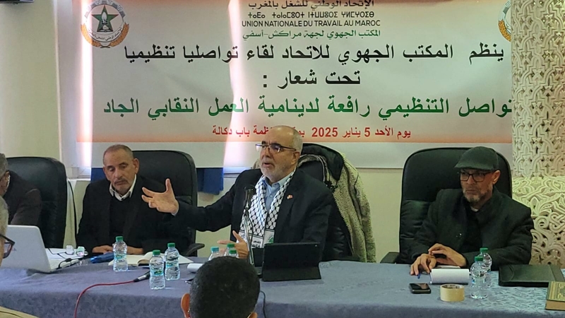 بتنسيق مع المكتب الجهوي لجهة مراكش آسفي، نظم المكتب الوطني للاتحاد الوطني للشغل بالمغرب، يوم الأحد 5 يناير 2025، لقاء تواصليا مع مناضلات ومناضلي الجهة، بمقر المنظمة بباب دكالة، تحت شعار: “التواصل التنظيمي رافعة لدينامية العمل النقابي الجاد”.