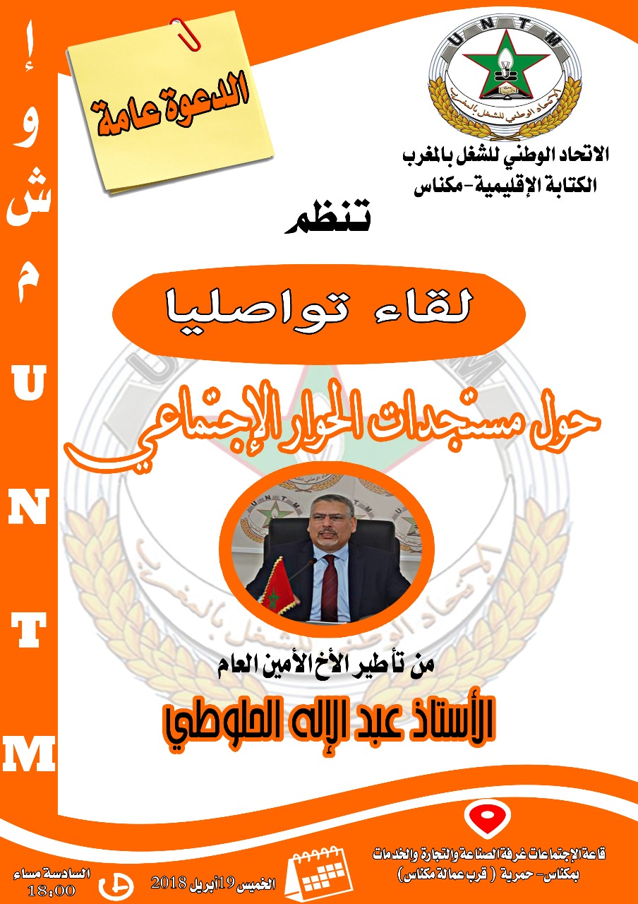 تنظم الكتابة الإقليمية للاتحاد الوطني للشغل بالمغرب بمدينة مكناس، الخميس 19 أبريل 2018، لقاء تواصليا، يؤطره الأخ الأمين العام للاتحاد الوطني للشغل بالمغرب عبد الإله الحلوطي.