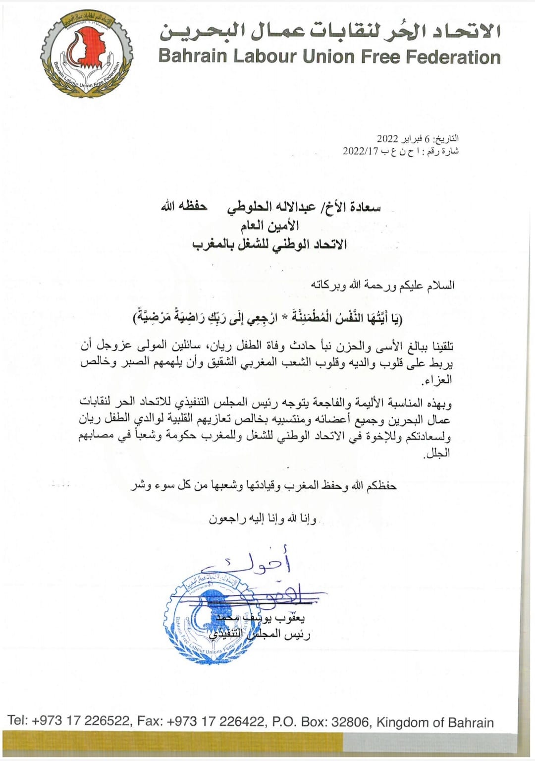 وقال الاتحاد الحر لنقابات عمال البحرين، في رسالة تعزية موجهة الى الاتحاد، أنه تلقى ببالغ الأسى والحزن نبأ حادث وفاة الطفل ريان، سائلا المولى عز وجل أن يربط على قلوب والديه وقلوب الشعب المغربي.