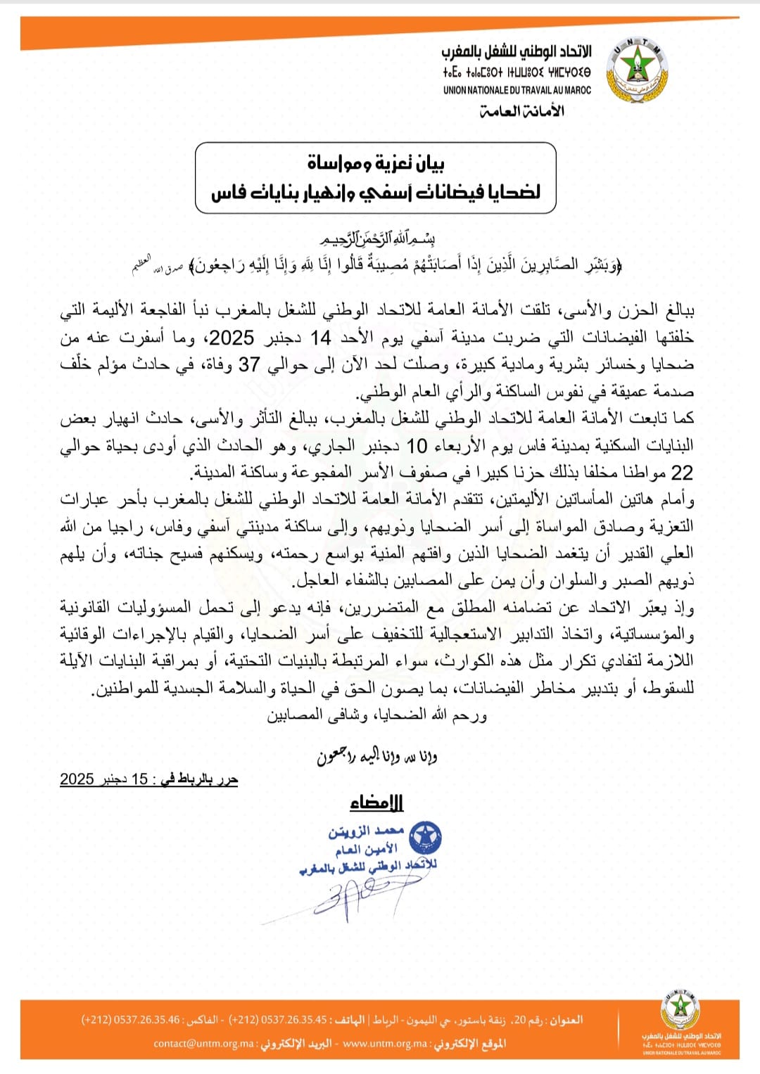 أعلنت الأمانة العامة للاتحاد الوطني للشغل بالمغرب، أنها تلقت ببالغ الحزن والأسى، نبأ الفاجعة الأليمة التي خلفتها الفيضانات التي ضربت مدينة آسفي يوم الأحد 14 دجنبر 2025، وما أسفرت عنه من ضحايا وخسائر بشرية ومادية كبيرة، وصلت لحد الآن إلى حوالي 37 وفاة، في حادث مؤلم خلّف صدمة عميقة في نفوس الساكنة والرأي العام الوطني.