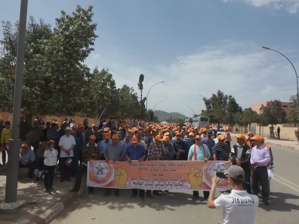 نظم المكتب الجهوي للاتحاد الوطني للشغل بالمغرب بجهة بني ملال خنيفرة احتفال فاتح ماي لهذه السنة بإقليم خنيفرة ، تميزت بمسيرة حاشدة بالإقليم ومهرجان خطابي حضره مناضلي ومناضلات الاتحاد والقطاعات والجامعات المنضوية تحت لوائه.