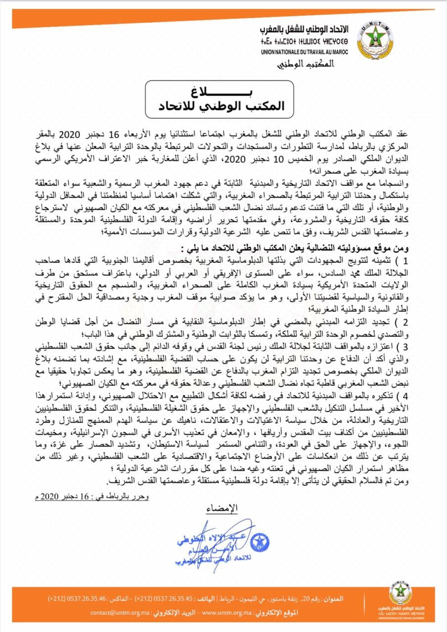 وجدد الاتحاد، خلال انعقاد اجتماع استثنائي لمكتبه الوطني بالمقر المركزي بالرباط، خصص لمدارسة التطورات والمستجدات والتحولات المرتبطة بالوحدة الترابية المعلن عنها في بلاغ الديوان الملكي الصادر يوم الخميس 10 دجنبر 2020، (جدد) التزامه المبدئي بالمضي في إطار الدبلوماسية النقابية في مسار النضال من أجل قضايا الوطن والتصدي لخصوم الوحدة الترابية للملكة، وتمسكا بالثوابت الوطنية والمشترك الوطني في هذا الباب.