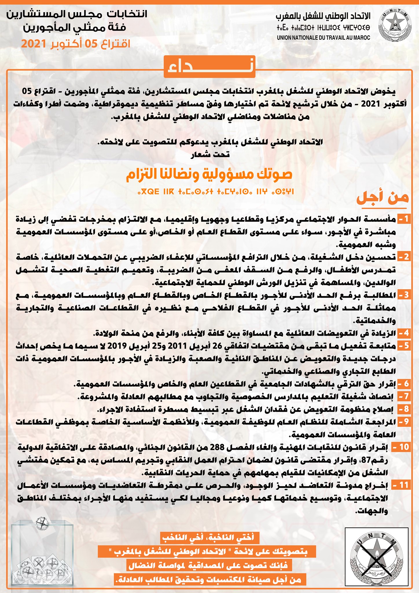 ودعا الاتحاد في نداء له الناخبين والناخبات، إلى التصويت على لائحته المكونة من عشرين مناضل ومناضلة، من أجل مأسسة الحوار الاجتماعي مركزيا وقطاعيا وجهويا وإقليميا، مع الالتزام بمخرجات تفضي إلى زيادة مباشرة في الأجور، سواء على مستوى القطاع العام أو الخاص، أو على مستوى المؤسسات العمومية وشبه العمومية.