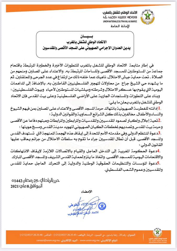 أعلن الاتحاد الوطني للشغل بالمغرب، إدانته للغطرسة الصهيونية بانتهاك حرمة المسجد الأقصى والاعتداء على المصلين بمن فيهم الشيوخ والنساء والأطفال، مخالفين بذلك كل الشرائع السماوية والقوانين الدولية.