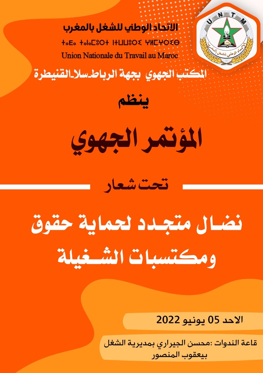 في إطار برنامج تجديد هيكلة المكاتب الجهوية للاتحاد الوطني للشغل بالمغرب، المصادق عليه من طرف المكتب الوطني، ينظم الاتحاد بجهة الرباط سلا القنيطرة يوم الأحد 5 يونيو 2022، بقاعة الندوات، محسن الجيراري بمديرية الشغل بيعقوب المنصور بمدينة الرباط، مؤتمره الجهوي الثالث تحت شعار “نضال متجدد لحماية حقوق ومكتسبات الشغيلة”.