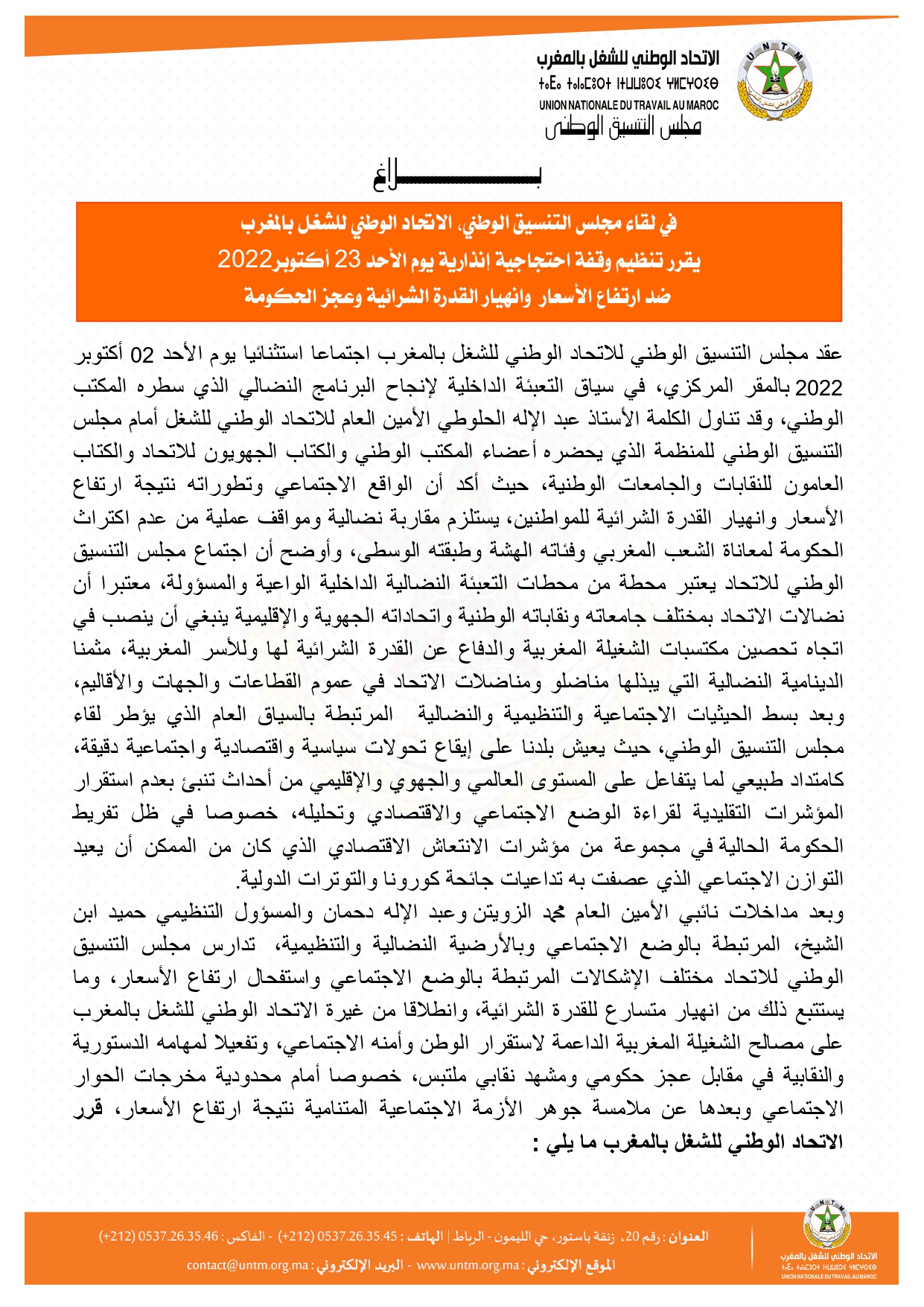 بلاغ مجلس التنسيق الوطني للاتحاد 02-10-2022