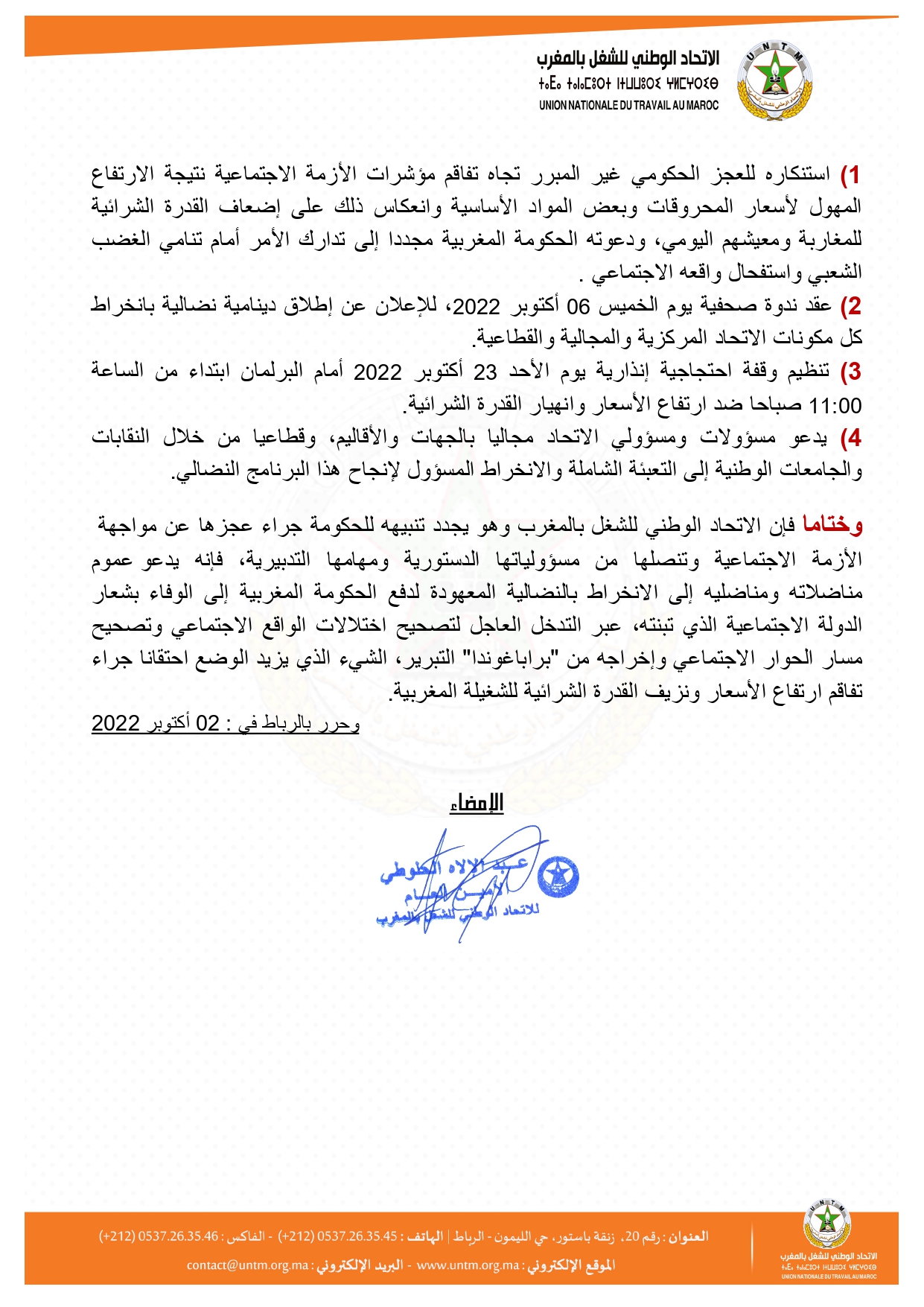 وأعلن الاتحاد، عقد ندوة صحفية يوم الخميس 06 أكتوبر 2022، للإعلان عن إطلاق دينامية نضالية بانخراط كل مكونات الاتحاد المركزية والمجالية والقطاعية.