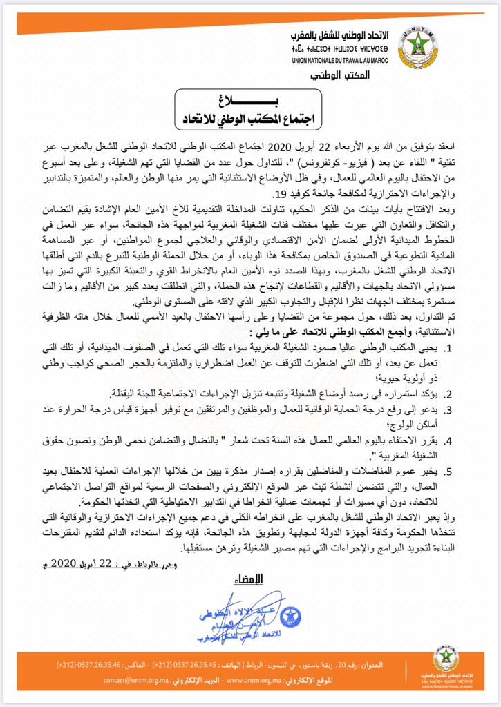 ودعا الاتحاد إلى رفع درجة الحماية الوقائية للعمال والموظفين والمرتفقين مع توفير أجهزة قياس درجة الحرارة عند أماكن الولوج، مؤكدا أنه قرر الاحتفاء باليوم العالمي للعمال هذه السنة تحت شعار ” بالنضال والتضامن نحمي الوطن ونصون حقوق الشغيلة المغربية “.