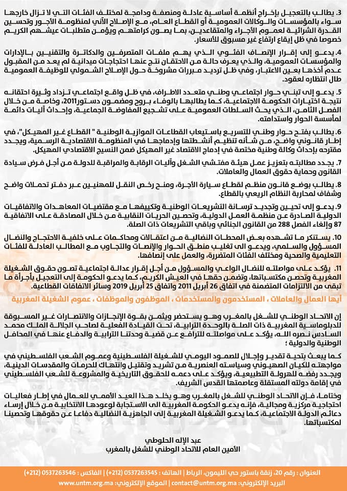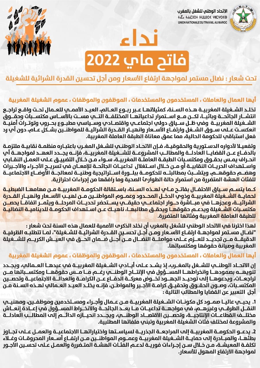 وختاما، فإن الاتحاد الوطني للشغل بالمغرب وهو يخلد هذا العيد الأممي للعمال في إطار فعاليات احتجاجية مركزية ومجالية، فإنه يدعو الحكومة المغربية الى الاستجابة لوعودها الانتخابية من خلال إرساء دعائم الدولة الاجتماعية، كما يدعو الشغيلة المغربية إلى الجاهزية النضالية دفاعا عن حقوقها وتحصينا لمكتسباتها.