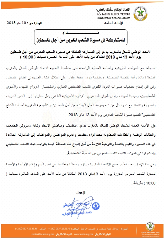 وطالب الاتحاد في نداء له، بالتعبئة والتوعية اللازمة من أجل إنجاح المسيرة المقرر تنظيمها الأحد 13 ماي 2018 انطلاقا من باب الأحد على الساعة العاشرة صباحا، قياما بالواجب تجاه الشعب الفلسطيني واستمرارا في الموقف الثابت للشعب المغربي من القضية الفلسطينية، وانسجاما مع المواقف التاريخية والقناعة المبدئية الراسخة لدى الاتحاد الوطني للشغل بالمغرب المنحازة دائما وأبدا للقضية الفلسطينية، وتجديدا لموقف الاتحاد الرافض للقرار العنصري للإدارة الأمريكية القاضي بنقل سفارتها إلى القدس الشريف.