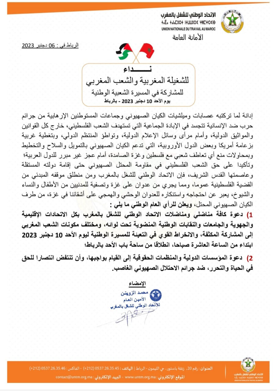 دعا الاتحاد الوطني للشغل بالمغرب، كافة مناضليه ومناضلاته بكل الاتحادات الإقليمية والجهوية والجامعات والنقابات الوطنية المنضوية تحت لوائه ، ومختلف مكونات الشعب المغربي إلى المشاركة المكثفة، والانخراط القوي في التعبئة للمسيرة الوطنية ليوم الأحد 10 دجنبر 2023 ابتداء من الساعة العاشرة صباحا، انطلاقا من ساحة باب الأحد بالرباط، لإدانة جرائم عصابات وميليشيات الكيان الصهيوني وجماعات المستوطنين الإرهابية من جرائم حرب ضد الإنسانية تتجدسد في الإبادة الجماعية التي تستهدف الشعب الفلسطيني.