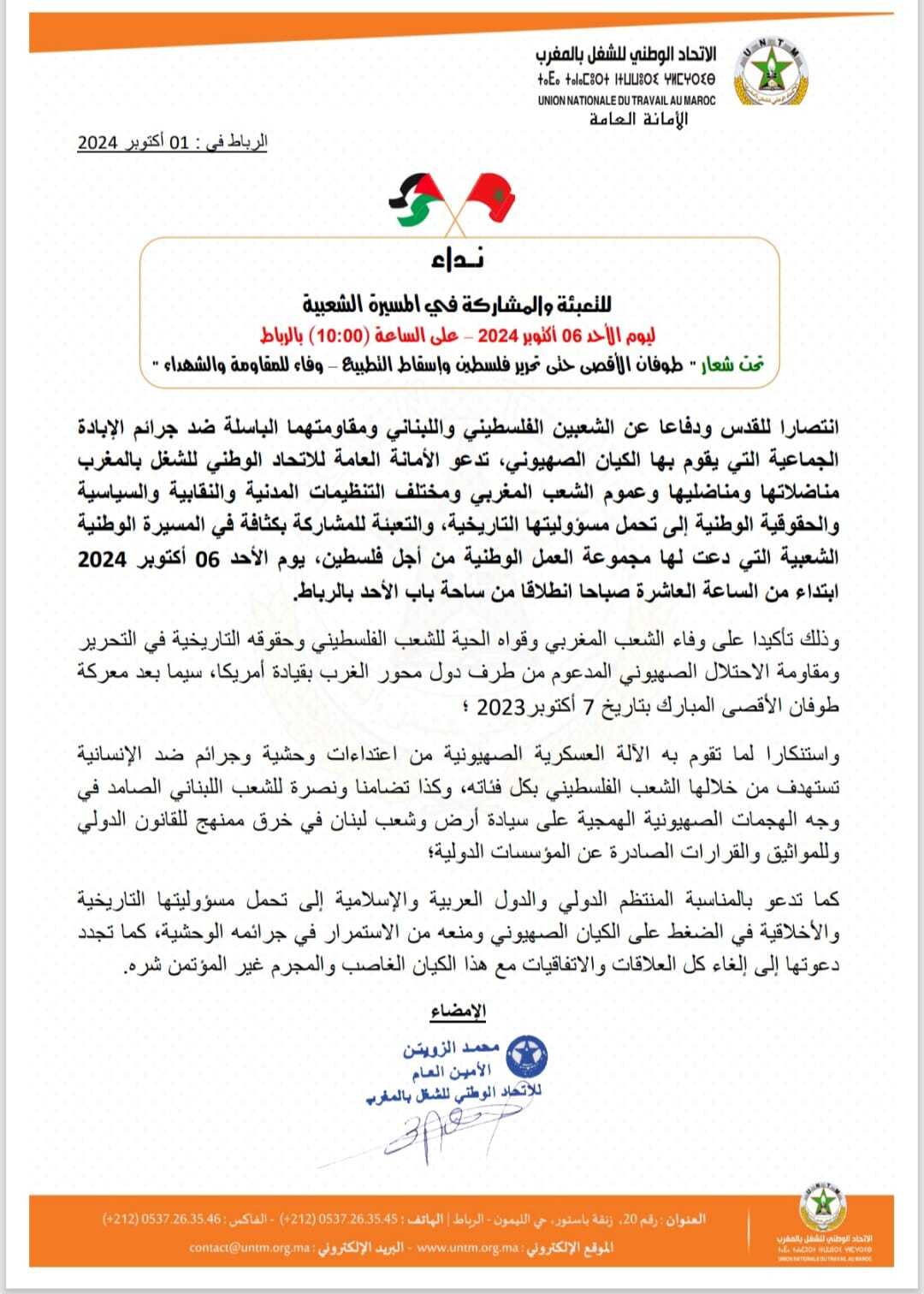 دعت الأمانة العامة للاتحاد الوطني للشغل بالمغرب مناضلاتها ومناضليها وعموم الشعب المغربي ومختلف التنظيمات المدنية والنقابية والسياسية والحقوقية الوطنية إلى تحمل مسؤوليتها التاريخية، والتعبئة للمشاركة بكثافة في المسيرة الوطنية الشعبية التي دعت لها مجموعة العمل الوطنية من أجل فلسطين، يوم الأحد 06 أكتوبر 2024 ابتداء من الساعة العاشرة صباحا انطلاقا من ساحة باب الأحد بالرباط، تحت شعار ” طوفان الأقصى حتى تحرير فلسطين وإسقاط التطبيع – وفاء للمقاومة والشهداء “.