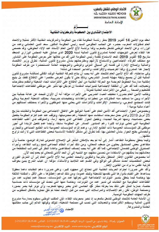 ودعا الأمين العام خلال اللقاء الذي خصص لمناقشة مشروع قانون مالية 2020، الحكومة إلى إتاحة الوقت الكافي للحركة النقابية لمناقشة مشروع قانون المالية قبل أن يصبح وثيقة مهيئة للمسار التشريعي، وذلك حتى لا يكون العرض مقتصرا على الاطلاع فقط، بل يتيح إمكانية مدارسة الخطوط العريضة مع الحركة النقابية من أجل الاطلاع على الالتزامات اتجاه الشغيلة والتقدم بمقترحات وتعديلات.