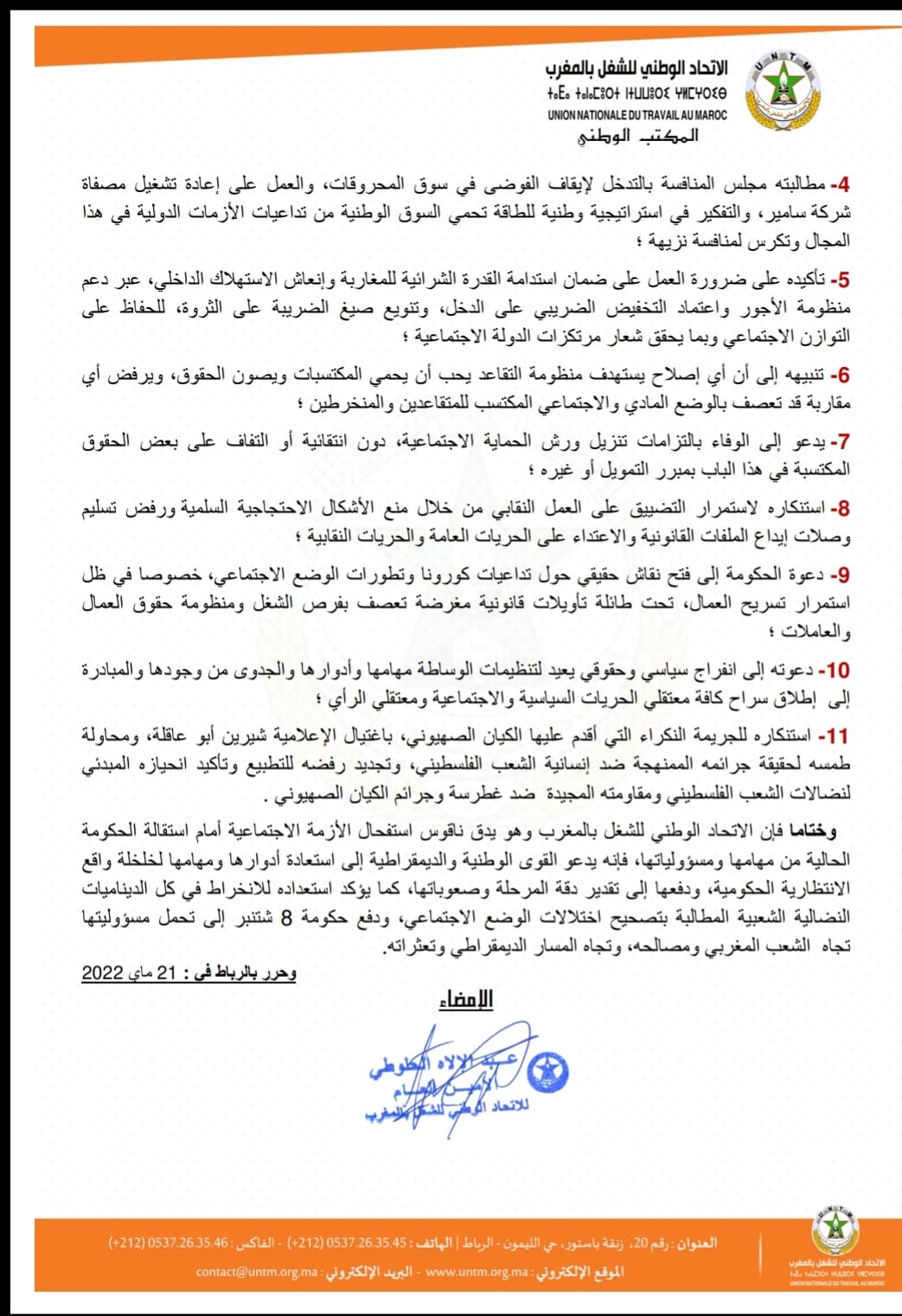 وطالب الاتحاد، في بلاغ له خلال انعقاد مكتبه الوطني السبت 21 ماي 2022، مجلس المنافسة بالتدخل لإيقاف الفوضى في سوق المحروقات، والعمل على إعادة تشغيل مصفاة شركة سامير، والتفكير في استراتيجية وطنية للطاقة تحمي السوق الوطنية من تداعيات الأزمات الدولية في هذا المجال وتكرس لمنافسة نزيهة ؛