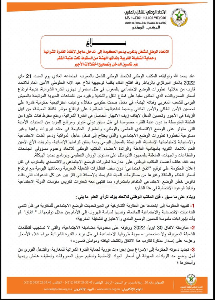 دعا الاتحاد الوطني للشغل بالمغرب، الحكومة إلى الإسراع بسن إجراءات فورية لحماية القدرة الشرائية للمغاربة، والتدخل الفوري من أجل وضع حد للزيادات المهولة في أسعار المواد الأساسية وتنظيم سوق المحروقات وتسقيف هامش ربحها وأسعارها.