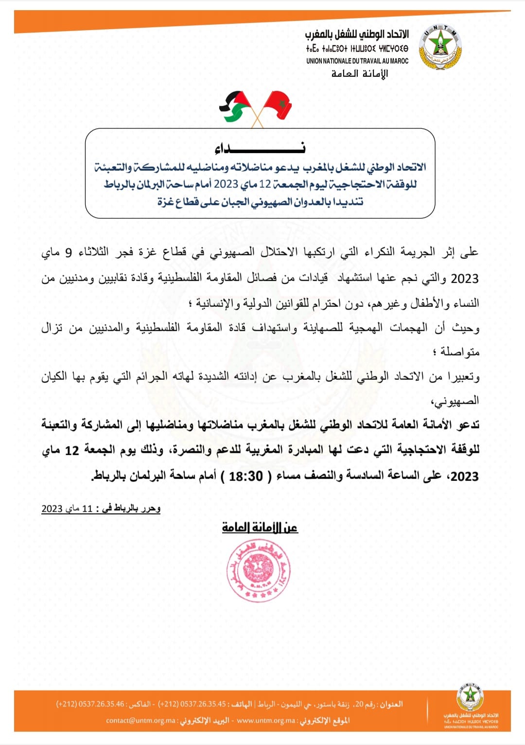 دعا الاتحاد الوطني للشغل بالمغرب، مناضلاته ومناضليه للمشاركة والتعبئة للوقفة الاحتجاجية ليوم الجمعة 12 ماي 2023 أمام ساحة البرلمان بالرباط تنديدا بالعدوان الصهيوني الجبان على قطاع غزة، إثر الجريمة النكراء التي ارتكبها الاحتلال الصهيوني في القطاع فجر الثلاثاء 9 ماي 2023 والتي نجم عنها استشهاد قيادات من فصائل المقاومة الفلسطينية وقادة نقابيين ومدنيين من النساء والأطفال وغيرهم، دون احترام للقوانين الدولية والإنسانية .