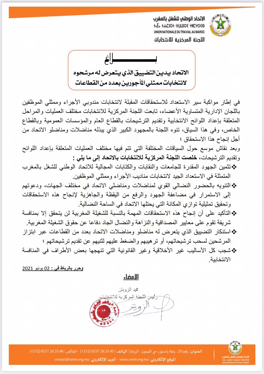 أعلن الاتحاد الوطني للشغل بالمغرب، استنكاره للتضييق الذي يتعرض له مناضلوه ومناضلاته بعدد من القطاعات عبر ابتزاز المرشحين لسحب ترشيحاتهم، أو ترهيبهم والضغط عليهم لثنيهم عن تقديم ترشيحاتهم.