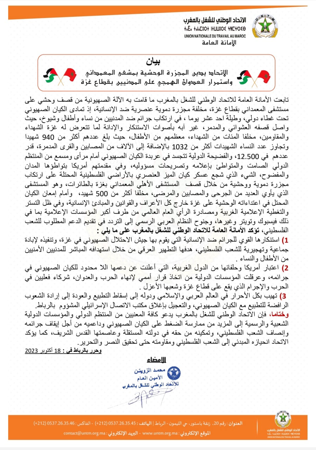 أعلن الاتحاد الوطني للشغل بالمغرب، أنه يتابع ما قامت به الآلة الصهيونية من قصف وحشي على مستشفى المعمداني بقطاع غزة، مخلفة مجزرة دموية عنصرية ضد الإنسانية، إذ تمادى الكيان الصهيوني تحت غطاء دولي، وطيلة احد عشر يوما ، في ارتكاب جرائم ضد المدنيين من نساء وأطفال وشيوخ، حيث واصل قصفه العشوائي والمدمر، غير آبه بأصوات الاستنكار والإدانة لما تتعرض له غزة الشهداء والمقاومين، مخلفا المئات من الشهداء، معظمهم من الأطفال، حيث بلغ عددهم أكثر من 940 شهيدا وتجاوز عدد النساء الشهيدات أكثر من 1032 بالإضافة إلى الآلاف من المصابين والقرى المدمرة، قدر عددهم في 12.500.