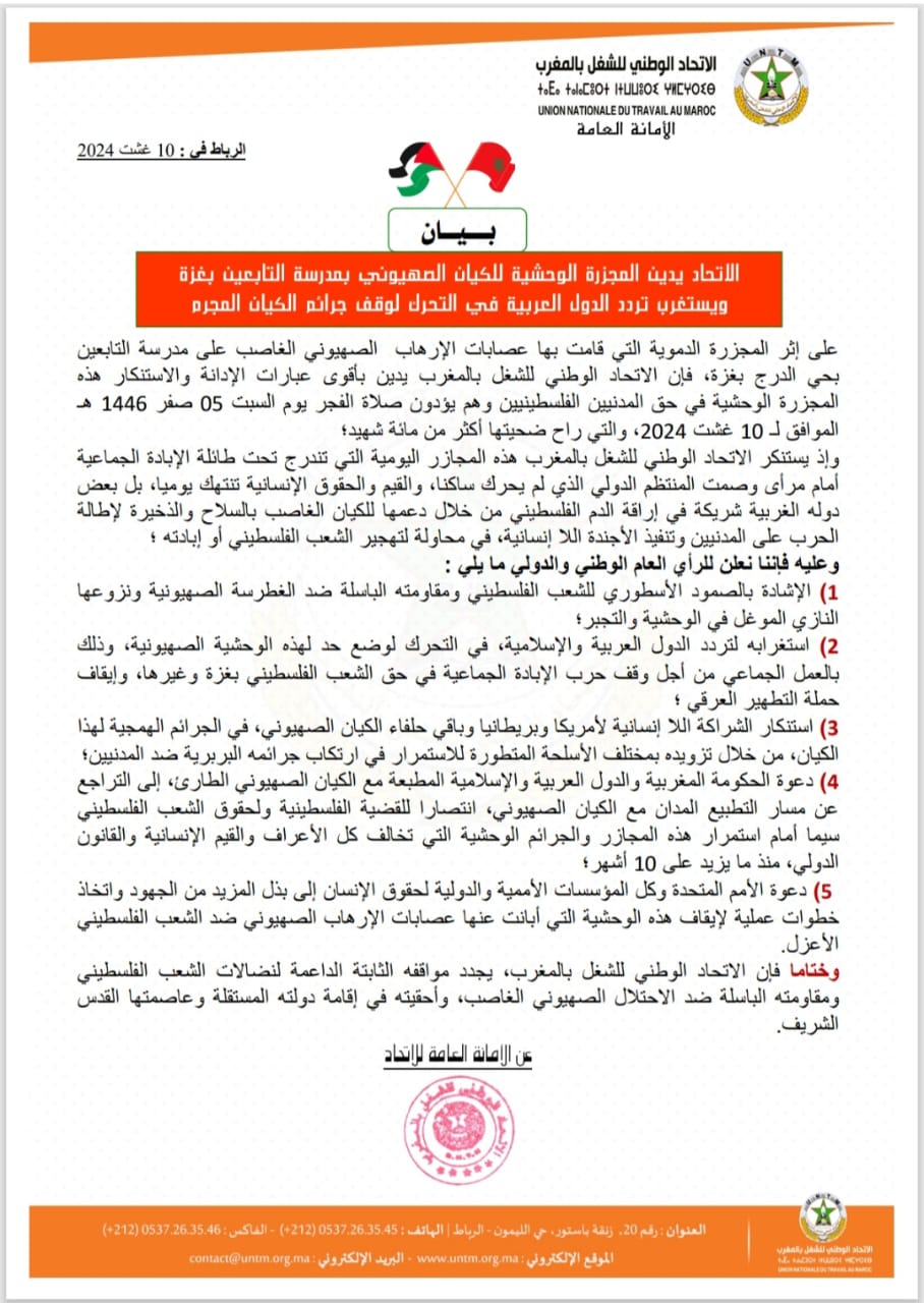 على إثر المجزرة الدموية التي قامت بها عصابات الإرهاب الصهيوني الغاصب على مدرسة التابعين بحي الدرج بغزة، فإن الاتحاد الوطني للشغل بالمغرب يدين بأقوى عبارات الإدانة والاستنكار هذه المجزرة الوحشية في حق المدنيين الفلسطينيين وهم يؤدون صلاة الفجر يوم السبت 05 صفر 1446 هـ الموافق لـ 10 غشت 2024، والتي راح ضحيتها أكثر من مائة شهيد؛