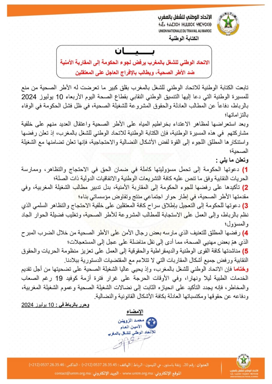 وبعد استعراضها لمظاهر الاعتداء بخراطيم المياه على الأطر الصحية واعتقال العديد منهم على خلفية مشاركتهم في هذه المسيرة الوطنية، فإن الكتابة الوطنية للاتحاد الوطني للشغل بالمغرب، إذ تعلن رفضها واستنكارها المطلق اللجوء إلى القوة لفض الأشكال النضالية والاحتجاجية، فإنها تعلن تضامنها مع الشغيلة الصحية؛