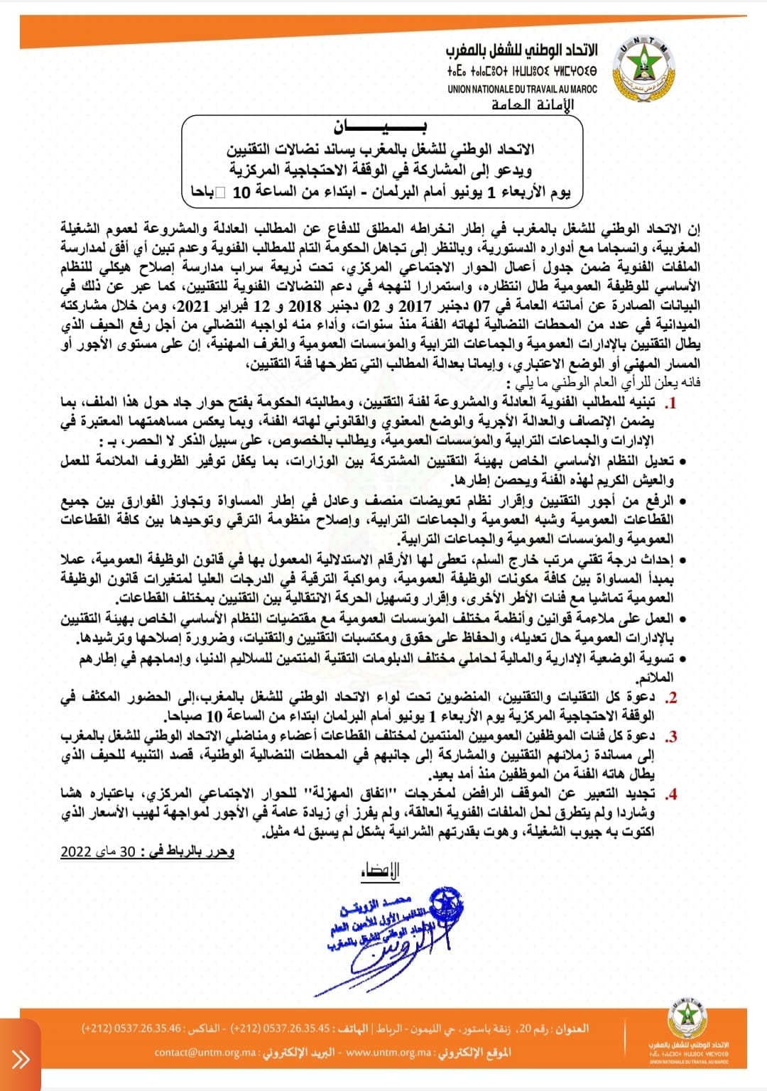ودعا كل التقنيات والتقنيين، المنضوين تحت لواء الاتحاد الوطني للشغل بالمغرب،إلى الحضور المكثف في الوقفة الاحتجاجية المركزية يوم الأربعاء 1 يونيو أمام البرلمان ابتداء من الساعة 10 صباحا، كما دعا كل فئات الموظفين العموميين المنتمين لمختلف القطاعات أعضاء ومناضلي الاتحاد الوطني للشغل بالمغرب إلى مساندة زملائهم التقنيين والمشاركة إلى جانبهم في المحطات النضالية الوطنية، قصد التنبيه للحيف الذي يطال هاته الفئة من الموظفين منذ أمد بعيد.