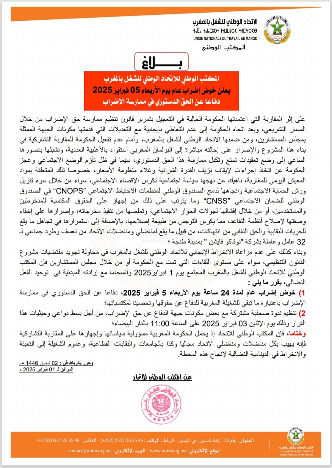 ودعا المكتب الوطني للاتحاد كافة مناضليه والنقابات القطاعية إلى التعبئة الجماعية لإنجاح هذه المحطة النضالية، مؤكدًا التزامه بالدفاع عن المكتسبات الاجتماعية والتصدي لأي محاولة لتقويض الحقوق النقابية.