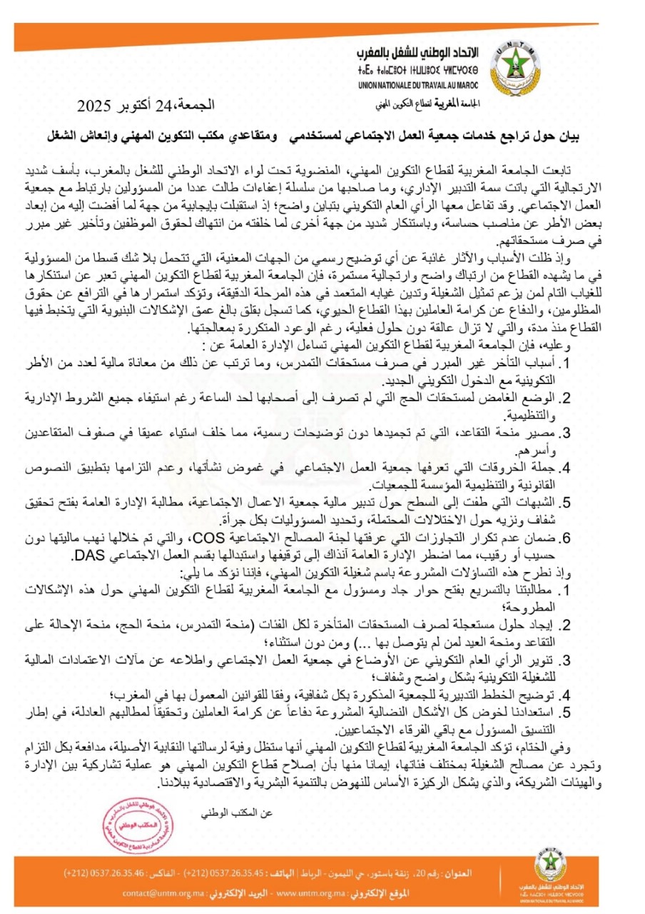 وشدّدت الجامعة المغربية لقطاع التكوين المهني على مطالبتها العاجلة بفتح حوار جاد ومسؤول مع الإدارة العامة لإيجاد حلول فورية لصرف جميع المستحقات المتأخرة، وضمان شفافية تدبير الموارد المالية للجمعية، مؤكدة استعدادها لخوض كل الأشكال النضالية المشروعة دفاعاً عن كرامة العاملين ومصالحهم العادلة.