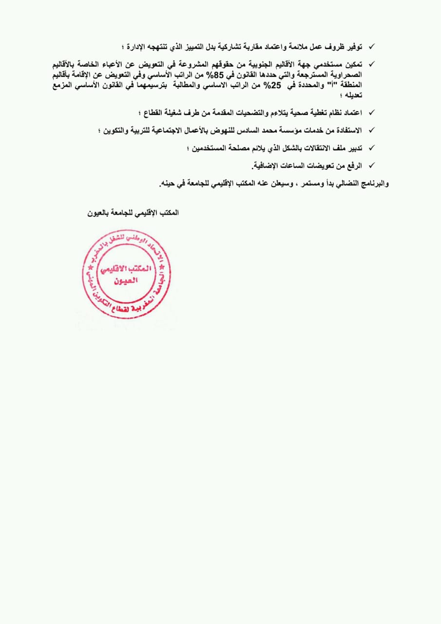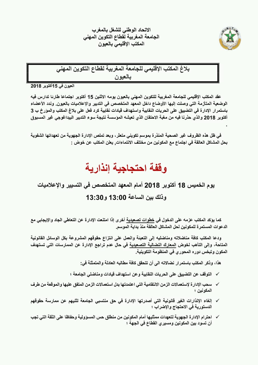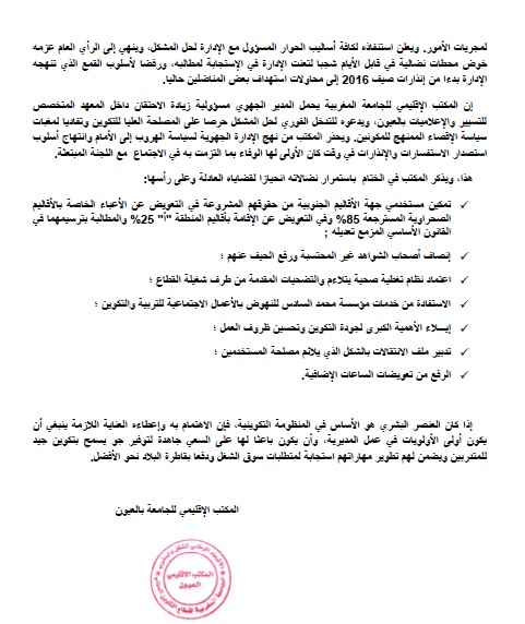 وأعلن المكتب عزمه خوض محطات نضالية في الأيام المقبلة شجبا لتعنت الإدارة في الاستجابة لمطالبه ورفضا لأسلوب القمع الذي تنهجه بدءا من إنذارات صيف 2016 إلى محاولات استهداف بعض المناضلين حاليا، مؤكدا الدخول في خطوات تصعيدية أخري بعد الوقفة الاحتجاجية الإنذارية التي نظمها الخميس 18 أكتوبر أمام المعهد المتخصص في التسيير والإعلاميات، في حالة امتناع الإدارة عن التعاطي الجاد والإيجابي مع الدعوات المستمرة لحل المشاكل العالقة منذ بداية الموسم.