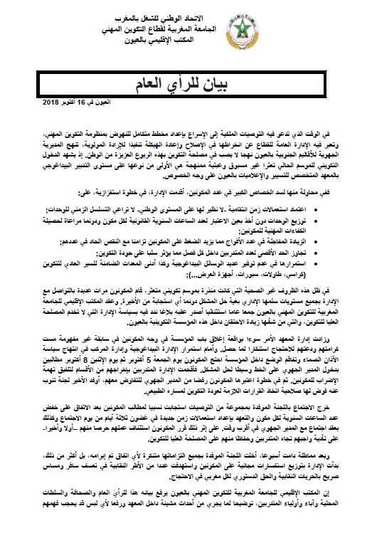 كما استنكر الزيادة المفاجئة في عدد الأفواج وتجاوز الحد الأقصى لعدد المتدربين داخل كل فصل، واستمرار الإدارة في عدم توفير الوسائل البيداغوجية والمعدات الضامنة للسير العادي للتكوين .
