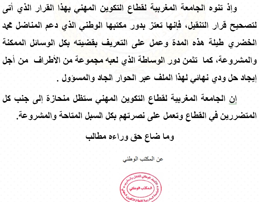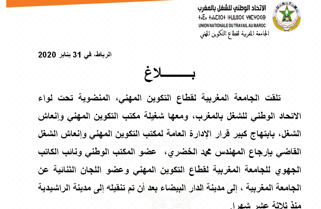نوهت الجامعة المغربية لقطاع التكوين المهني، المنضوية تحت لواء الاتحاد الوطني للشغل بالمغرب، بقرار الإدارة العامة لمكتب التكوين المهني وإنعاش الشغل القاضي بإرجاع المهندس محمد الخضري، عضو المكتب الوطني ونائب الكاتب الجهوي للجامعة المغربية لقطاع التكوين المهني وعضو اللجان الثنائية عن الجامعة المغربية ، إلى مدينة الدار البيضاء بعد أن تم تنقيله إلى مدينة الراشيدية منذ ثلاثة عشر شهرا.