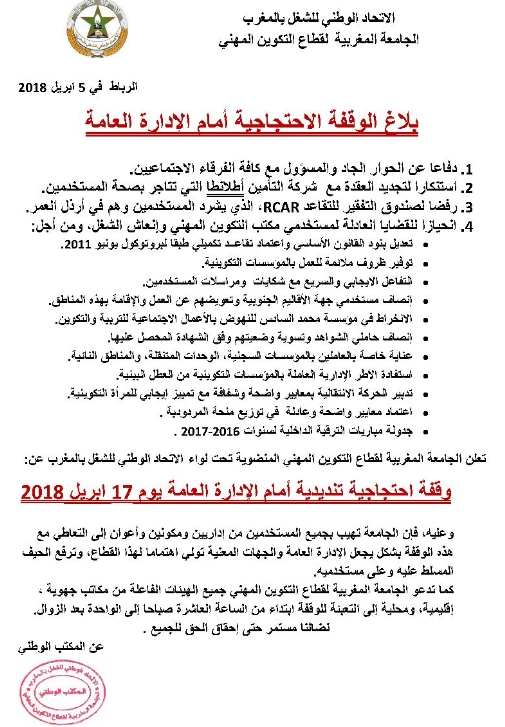 تنظم الجامعة المغربية لقطاع التكوين المنضوية تحت لواء الاتحاد الوطني للشغل بالمغرب، الثلاثاء 17 أبريل 2018، وقفة احتجاجية تنديدية أمام الإدارة العامة، وذلك دفاعا عن الحوار الجاد والمسؤول مع كافة الفرقاء الاجتماعيين، واستنكارا لتجديد العقدة مع شركة التأمين التي تضرر منها العديد من الشغيلة.