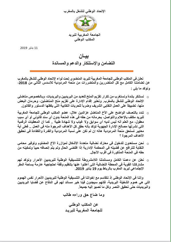 وأعلنت الجامعة عن دعمها الكامل ومساندتها اللامشروطة للتنسيقية الوطنية للبريديين الأحرار، مؤكدة مشاركتها القوية في المحطة النضالية التي أعلنت عنها هذه الأخيرة بتنظيم وقفة احتجاجية عارمة بساحة المقر الإجتماعي لبريد المغرب بالرباط يوم 19 يناير