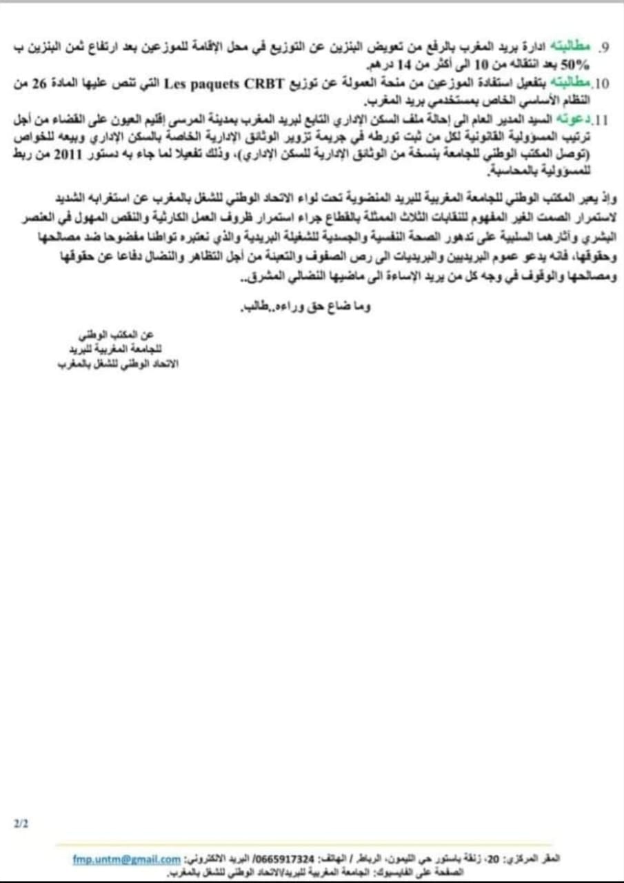 وطالبت الجامعة، ادرة بريد المغرب بجبر ضرر جميع البريديين والبريديات الذين لم يستفيدوا من عملية التفريغ بمنحهم سلمين إضافيين على الأقل، والرفع من تعويض البنزين عن التوزيع في محل الإقامة للموزعين بعد ارتفاع ثمن البنزين ب %50 بعد انتقاله من 10 الى أكثر من 14 درهم، وتفعيل استفادة الموزعين من منحة العمولة عن توزيع Les paquets CRBT التي تنص عليها المادة 26 من النظام الأساسي الخاص بمستخدمي بريد المغرب.