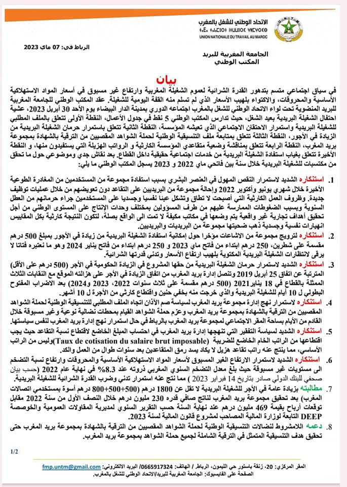 واستنكرت استمرار حرمان الشغيلة البريدية من حقها المشروع في الزيادة الحكومية في الأجر (500 درهم على الأقل) المترتبة عن اتفاق 25 أبريل 2019 وتنصل إدارة بريد المغرب من اتفاق الزيادة في الأجر على هزالته الموقع مع النقابات الثلاث الممثلة بالقطاع في 18 يناير2021 (500 درهم مقسمة على ثلاث سنوات 2022، 2023 و2024) بعد الاضراب المفتوح البطولي ل 10 أيام للشغيلة البريدية والذي خرجت منه بخفي حنين واقتطاع كارثي من الأجرة ل 10 أشهر.