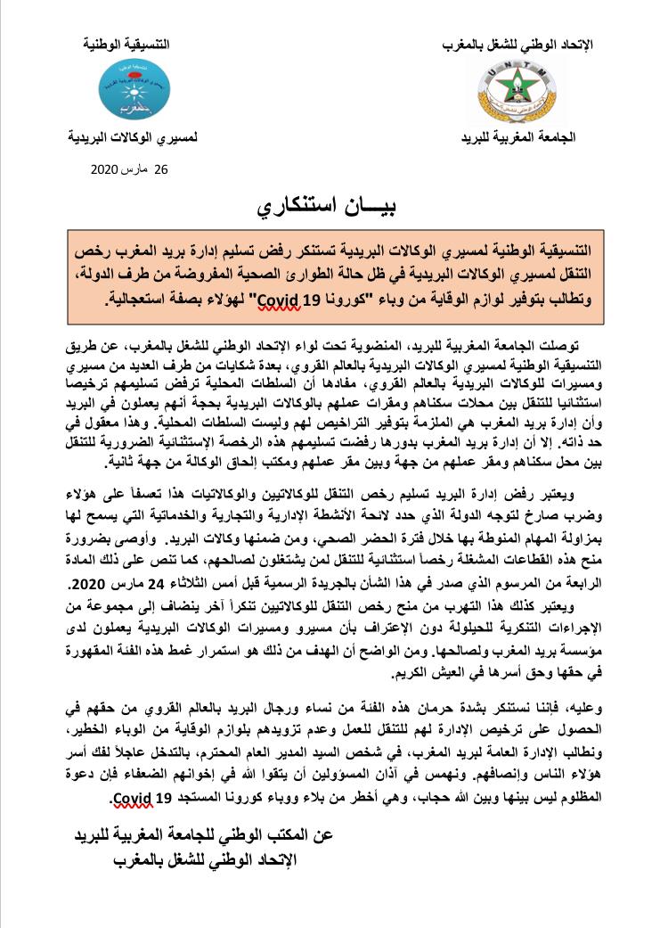 واعتبرت الجامعة أن هذا التهرب من منح رخص التنقل للوكالاتيين، يعد تنكراً آخرا ينضاف إلى مجموعة من الإجراءات التنكرية للحيلولة دون الإعتراف بأن مسيرو ومسيرات الوكالات البريدية يعملون لدى مؤسسة بريد المغرب ولصالحها، مستنكرة حرمان هذه الفئة من نساء ورجال البريد بالعالم القروي من حقهم في الحصول على ترخيص الإدارة لهم للتنقل للعمل وعدم تزويدهم بلوازم الوقاية من الوباء الخطير.