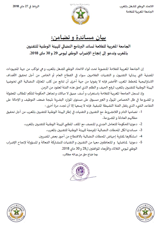 أعلنت الجامعة المغربية لقطاع الفلاحة المنضوية تحت لواء الاتحاد الوطني للشغل بالمغرب، عن تضامنها التام واللامشروط مع التقنيين في إطار الهيئة الوطنية للتقنيين بالمغرب من أجل تحقيق مطالبهم العادلة والمشروعة.