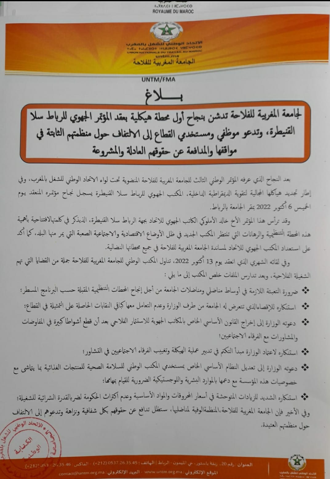 واستنكرت الجامعة، خلال اللقاءه الشهري لمكتبها الوطني الذي انعقد يوم 13 اكتوبر 2022، الإقصاء الذي تتعرض له من طرف الوزارة وعدم التعامل معها كنقابة حاصلة على التمثيلة في القطاع الفلاحي.
