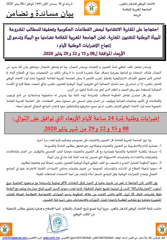 أعلنت الجامعة المغربية للفلاحة المنضوية تحت لواء الاتحاد الوطني للشغل بالمغرب تضامنها  مع الهيأة الوطنية للتقنيين المغاربة ضد المقاربة الانتقامية لبعض القطاعات الحكومية وتحقيقا لمطالبها المشروعة، داعية إلى إنجاح الإضرابات الوطنية لأيام الأربعاء الموافقة ل08 و 15و 22 و 29يناير2020.