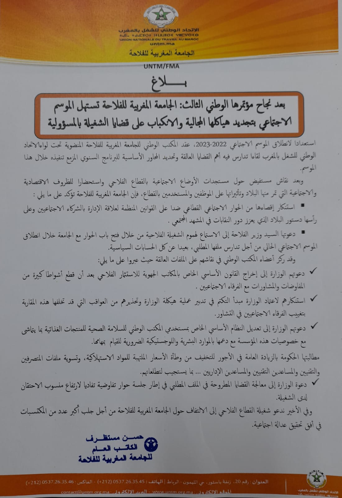عقد المكتب الوطني للجامعة المغربية للفلاحة المنضوية تحت لواءالاتحاد الوطني للشغل بالمغرب، لقاءا استعدادا لانطلاق الموسم الاجتماعي 2022-2023، تدارس فيه أهم القضايا العالقة والمحاور الأساسية للبرنامج السنوي المزمع تنفيذه خلال هذا الموسم.