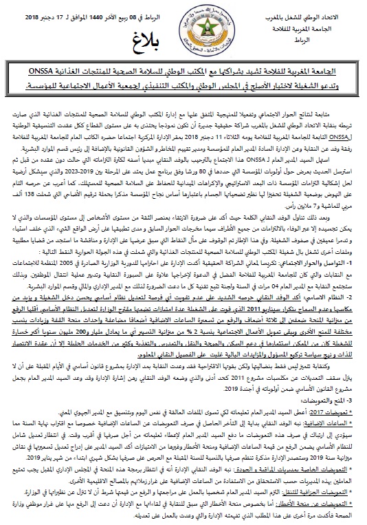 وشدد الوفد النقابي للتنسيقية في اجتماع عقد الثلاثاء11 دجنبر2018 بمقر الإدارةالمركزية لـ onssa، حضره الكاتب العام للجامعة المغربية للفلاحة رفقة وفد عن النقابة وعن الإدارة، المدير العام للمؤسسة ومدير تقييم المخاطر و الشؤون القانونية بالإضافة إلى رئيس قسم الموارد البشرية، شدد على ضرورة التواصل والحوار الاجتماعي، تكريسا لمعاني الشراكة الحقيقية.