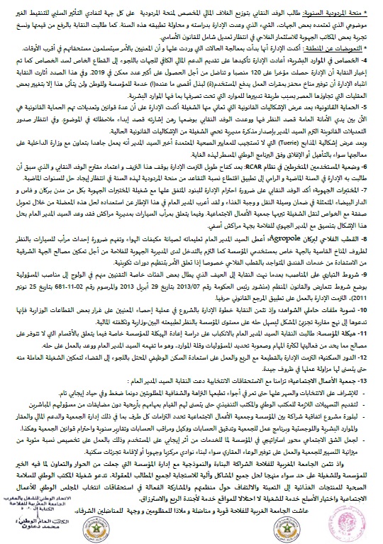 وكشف الوفد النقابي أن إدارة المؤسسة التزمت بالاستجابة لمجموعة من المطالب التي تقدمت بها التنسيقية.