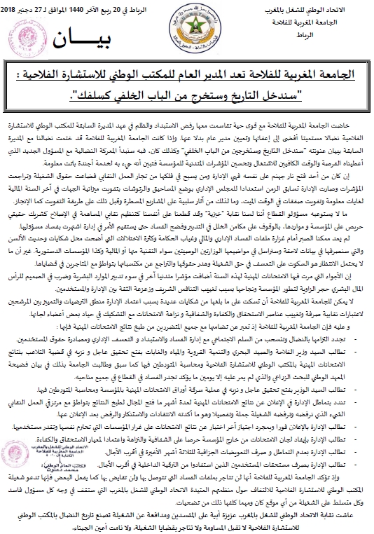 وأكدت الجامعة “أنه لم يعد ممكنا الصبر أمام ملفات الفساد الإداري والمالي وغياب الحكامة وكثرة الاختلالات والتعسف في حق الشغيلة وهدر حقوقها والتراجع عن مكتسباتها في المكتب الوطني للاستشارة الفلاحية “، مشيرة إلى أنها ستوضح ذلك في بيانات لاحقة وستراسل في مواضيعها الوزارتين الوصيتين سواء التقنية منها أو المالية وكذا المؤسسات الدستورية.