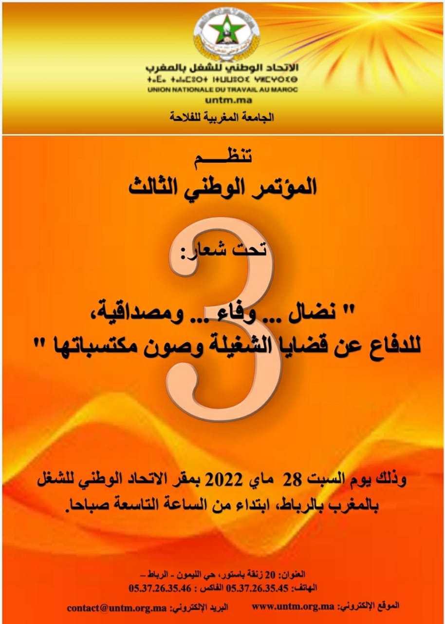 في إطار استكمال الهيكلة للجامعات والنقابات المنضوية تحت لواء الاتحاد الوطني للشغل بالمغرب، وذلك وفق المقرر التنظيمي الذي صادق عليه المكتب الوطني للاتحاد، تعقد الجامعة المغربية للفلاحة، السبت 28 ماي 2022ـ بالمقر المركزي للاتحاد مؤتمرها الوطني الثالث، تحت شعار ” نضال..وفاء.. مصداقية، للدفاع عن قضايا الشغيلة وصون مكتسباتها”.
